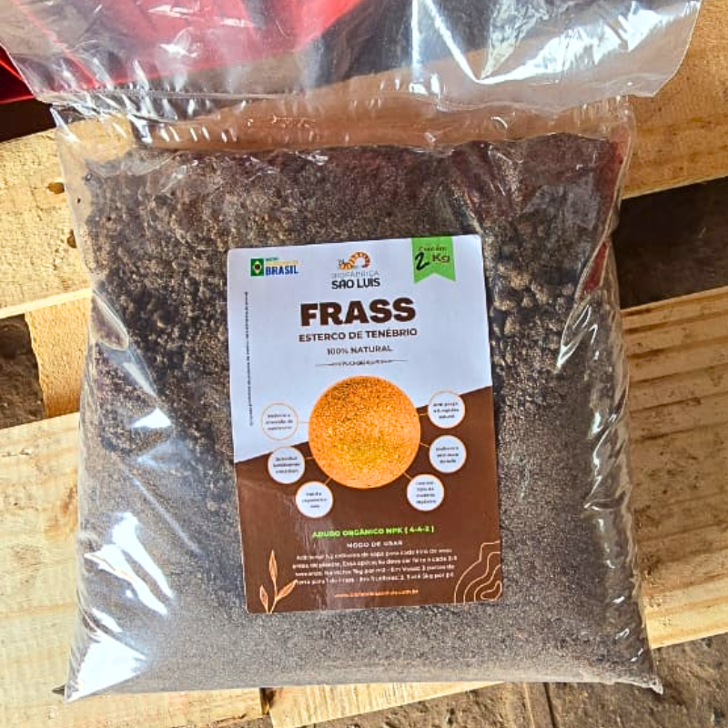 O Frass de Tenébrios é um fertilizante orgânico obtido a partir das fezes e resíduos naturais do Tenébrio molitor. Rico em quitina, nitrogênio, potássio, aminoácidos e microrganismos benéficos, ele melhora a saúde do solo, estimula o desenvolvimento radicular e fortalece as plantas contra pragas e doenças. Ideal para hortas, frutíferas, ornamentais, vasos e produção orgânica.
